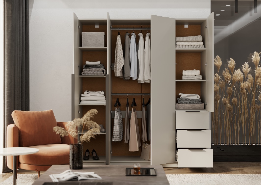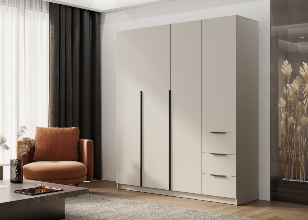Максимальная вместимость: Просторная конструкция с четырьмя створками и тремя выдвижными ящиками позволяет систематизировать хранение всего гардероба, от объемных вещей до мелких аксессуаров.